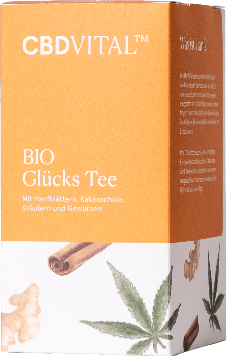 Die besondere Bio-Teemischung mit Hanfblättern, Kakaoschale, Kräuter und Gewürzen sorgt für wärmende Glücksmomente im Alltag. Neben dem typisch vollmundigen Aroma der Hanfblätter sorgen Kakaoschalen, Zimt, Gewürznelken und Rosmarin für einen verführerischen Duft in Ihrer Tasse. Durch die natürliche Schärfe von Ingwer und Pfeffer wärmt der CBD VITAL BIO Glücks Tee von innen heraus – für ein wohlig-warmes Gefühl im Magen. Brombeerblätter ergänzen die einzigartige Teemischung mit Ihrem blumig-süßen Geschmack. Kardamom, die „Königin der Gewürze“ sorgt für das geheimnisvolle Tee-Aroma – ein fruchtig-zitroniger Duft, der einen angenehm erfrischenden Geschmack hinterlässt.