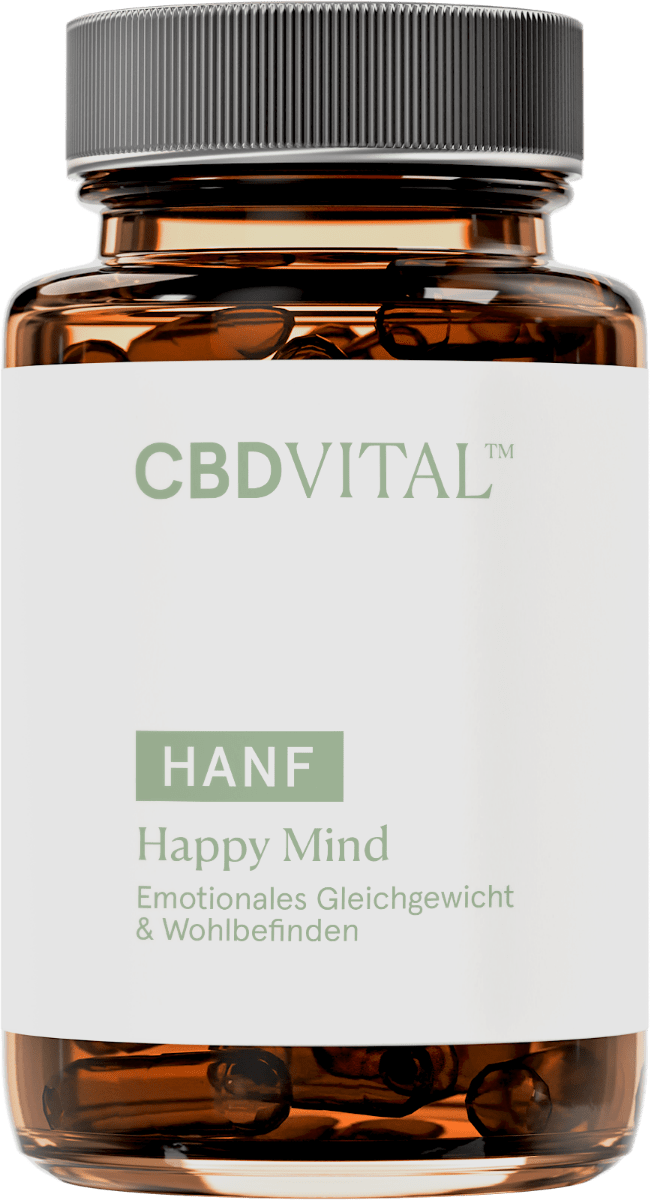 Komplex von CBD VITAL mit Pflanzenextrakten, Aminosäuren, Vitaminen, Spurenelementen und Coenzym Q10 – Mehr Leichtigkeit und Freude im Alltag. Hanf Happy Mind ist eine einzigartige Formel aus ausgewählten Mikronährstoffen und pflanzlichen Inhaltsstoffen. Das synergistische Zusammenspiel zwischen speziellen Aminosäuren, Vitaminen, Spurenelementen sowie Hanfblättern und erlesenen Pflanzenextrakten erfüllt die Voraussetzungen für mehr Leichtigkeit im Alltag. Die Aminosäure L-Tryptophan ist ein Baustoff, der für die körpereigenen Bildung von Serotonin benötigt wird. 5-Hydroxytryptophan (5-HTP) fungiert als direkte Vorstufe von Serotonin und wird aus der Schwarzbohne (Griffonia) gewonnen. Mit Eisen für Power und Elan im CBD VITAL Hanf Happy Mind Komplex. Aktivierte B-Vitamine (ideal dosiert) werden optimal vom Körper aufgenommen und sind wichtig für eine normale Nervenfunktion.